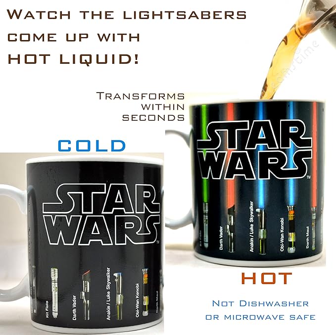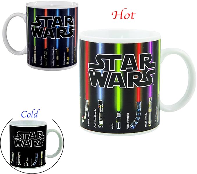 - ❤️ COLOR CHANGING MUG- Pour in hot liquid and watch the lightsabers appear. This heat changing mug is thermochromatic, which is a scientific word for magic